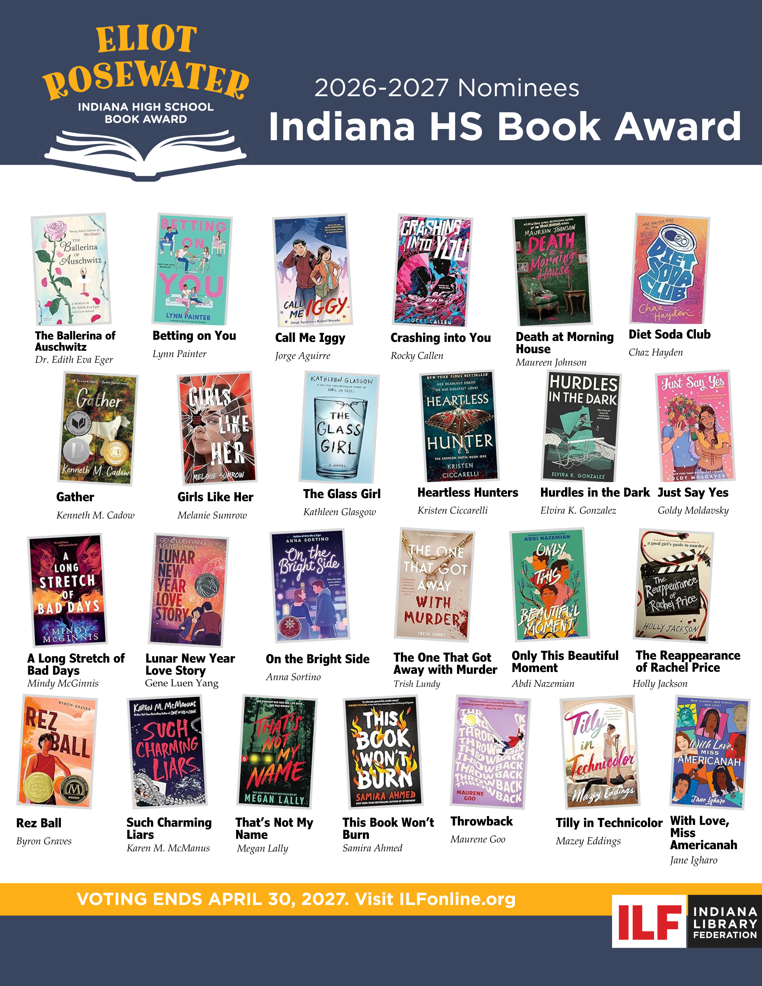 The Eliot Rosewater Indiana High School Book Award (Rosie Award) is chosen annually by students across Indiana in grades nine through twelve. Students at participating high schools, public libraries, or homeschoolers who read any of approximately 20 nominated books are eligible to rate each book they've read.