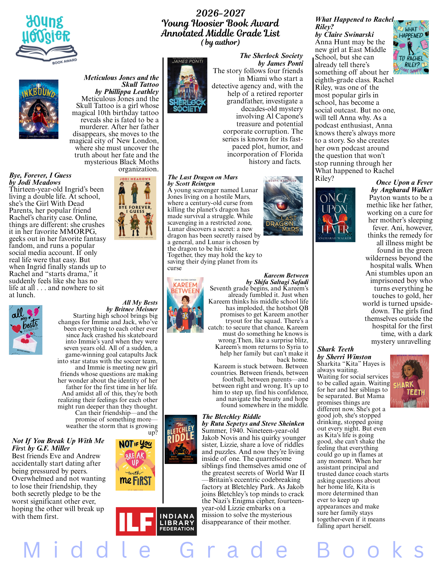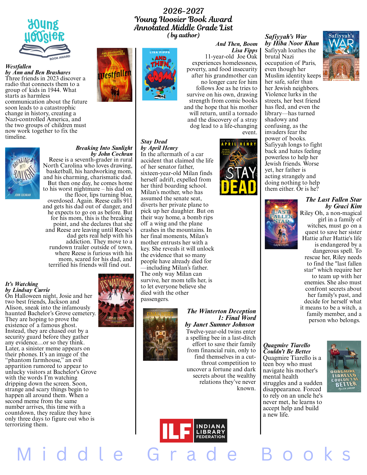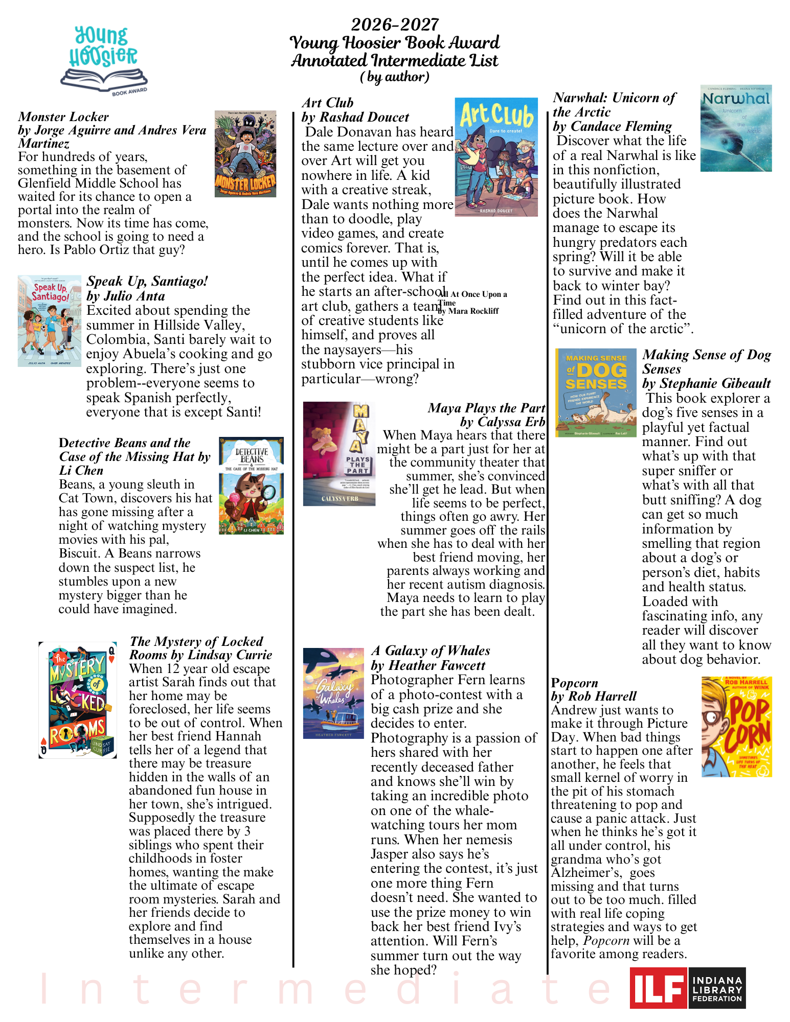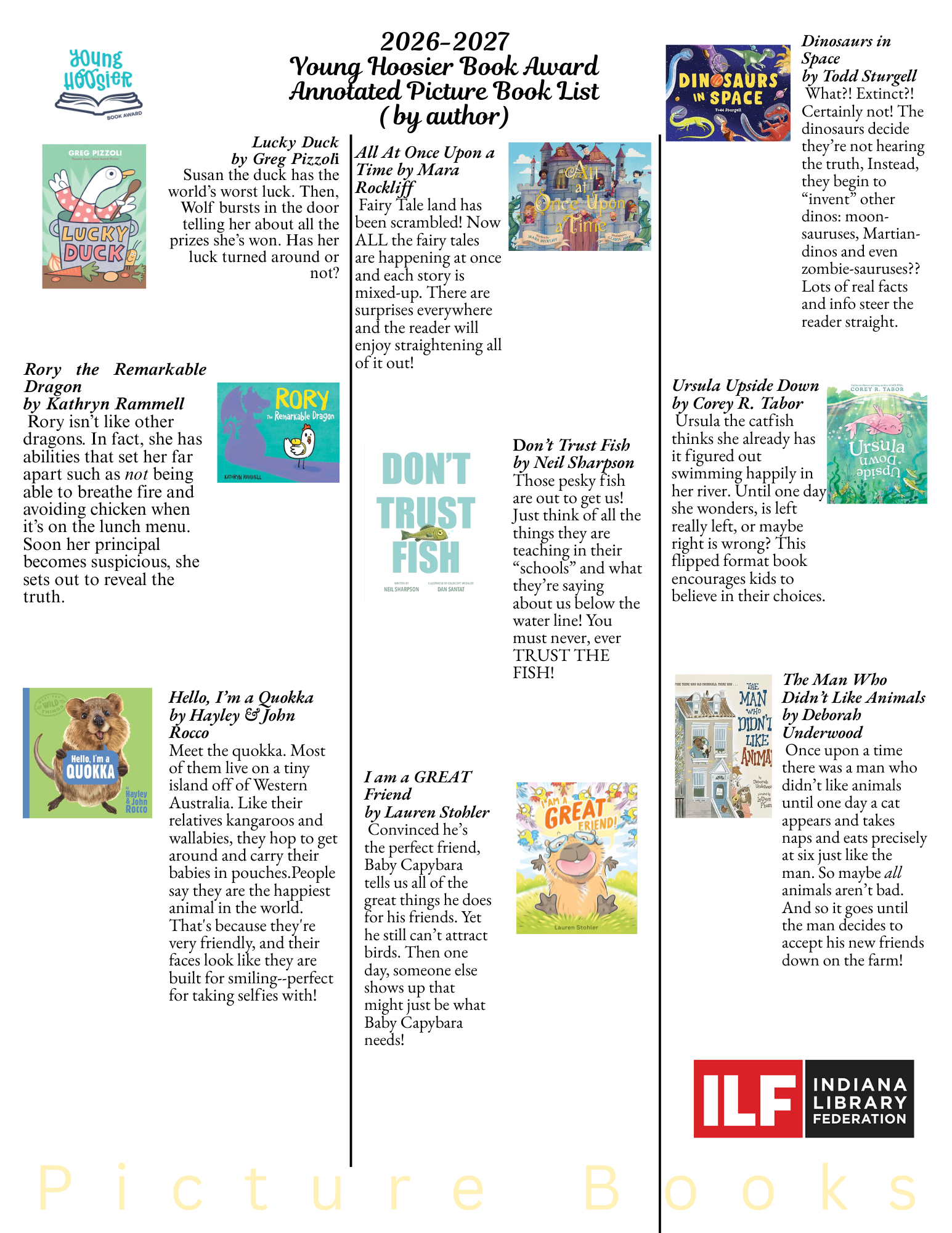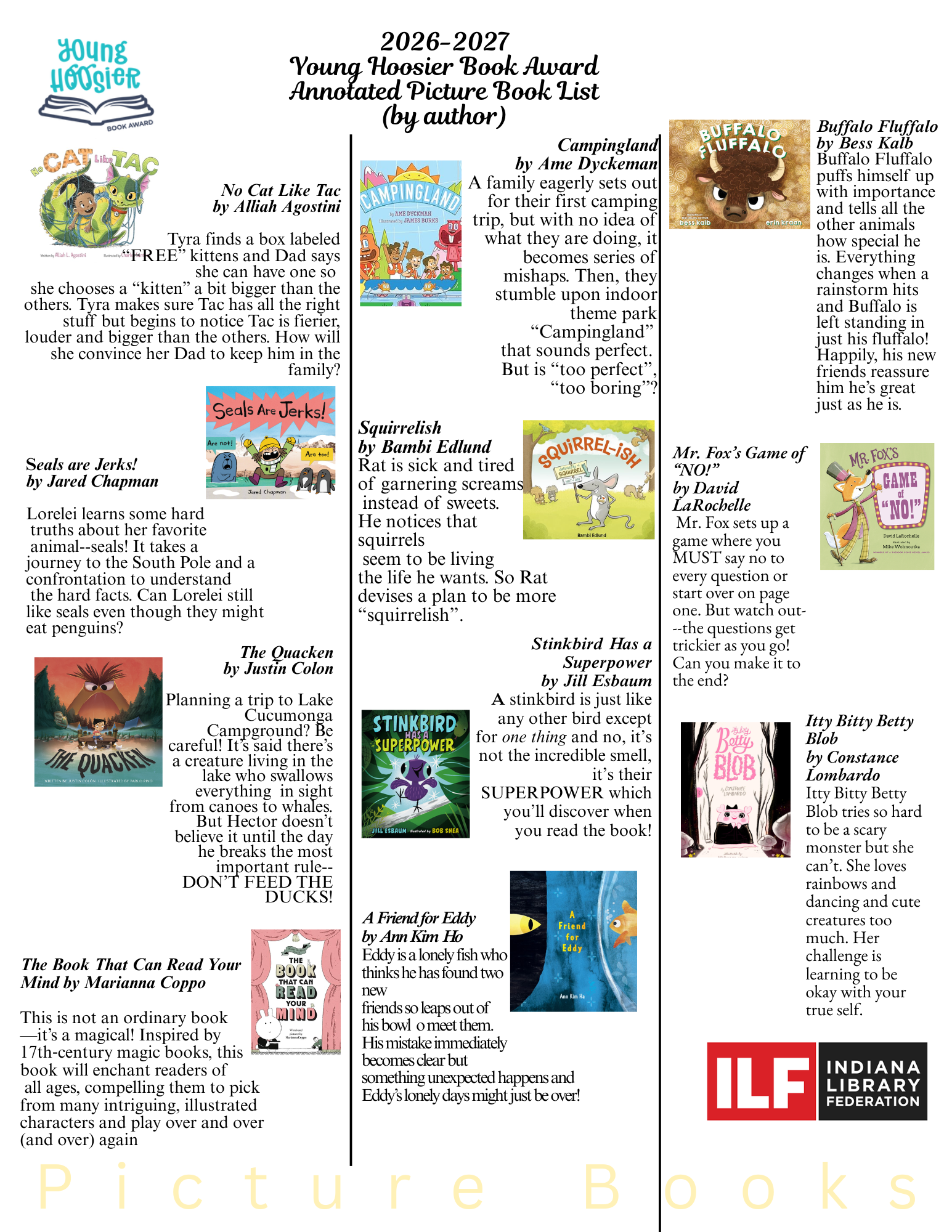 ![]() The Young Hoosier Book Award Program encourages self-selected reading among elementary and middle school/junior high school students. Congratulations to the 2024 - 2025 YHBA Winners!
